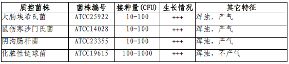 按标签用法制备培养基,接种以下质控菌株,放置36±1℃需氧培养18-24小时。
