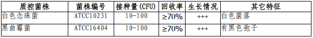 按标签用法制备培养基,接种以下质控菌株,放置20-25℃需氧培养48-72小时。 注:回收率计算时,用SDA琼脂做对照培养基。