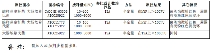 检验原理: 胰酪胨、植物胨提供氮源、维生素和生长因子;葡萄糖提供碳源;磷酸氢二钾为缓冲剂;氯化钠维持均衡的渗透压;多粘菌素B 可抑制杂菌的生长。