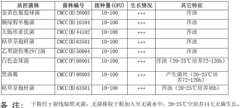 干粉经辐照灭菌。无菌称取干粉加入至无菌水中,20-25℃空培养14天无菌生长。