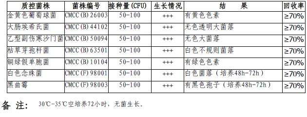 接种以下质控菌株,放置30-35℃需氧培养18-24小时。 注:回收率计算时,用TSA琼脂做对照培养基。