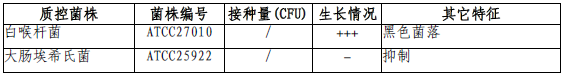 按标签用法制备培养基,接种以下质控菌株,放置37℃需氧培养48小时。