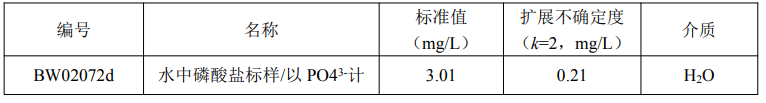 本标准品应按以下程序稀释后方可使用:用清洁干燥的移液管从安瓿瓶中准确移取 10.0mL 标样至 250mL 容量瓶中,用纯水稀释定容至刻度,混匀后立即使用。稀释后的标准值和扩展不确定度为: