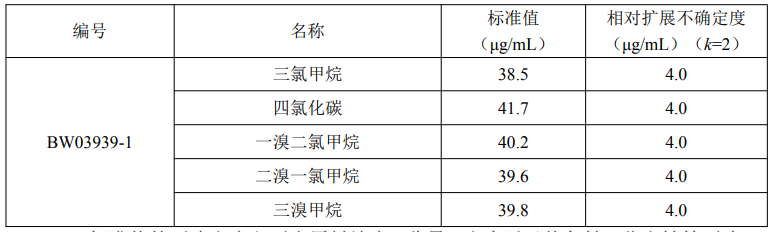 本标准物质采用纯度准确定值的 5 种卤代烃为原料,以色谱级甲醇为溶剂,采用重量容量法准确配制而成。