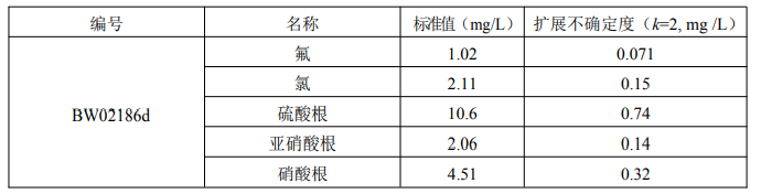 本标准物质用于水中氟、氯、硝酸根、亚硝酸根、硫酸根的分析测试及宣贯的分析方法确认与评价、实验室质量控制。