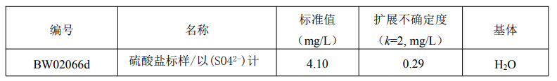 本标准品应按以下程序稀释后方可使用:用清洁干燥的移液管从安瓿瓶中准确移取 10.0mL 标样至 250mL 容量瓶中,用纯水稀释定容至刻度,混匀后立即使用。稀释后的标准值和扩展不确定度为: