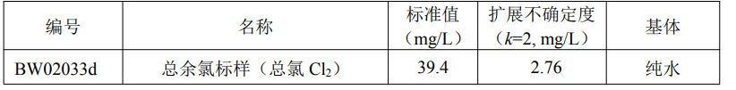 本标准样品用于总余氯的分析测试及宣贯的分析方法确认与评价、实验室质量控制。